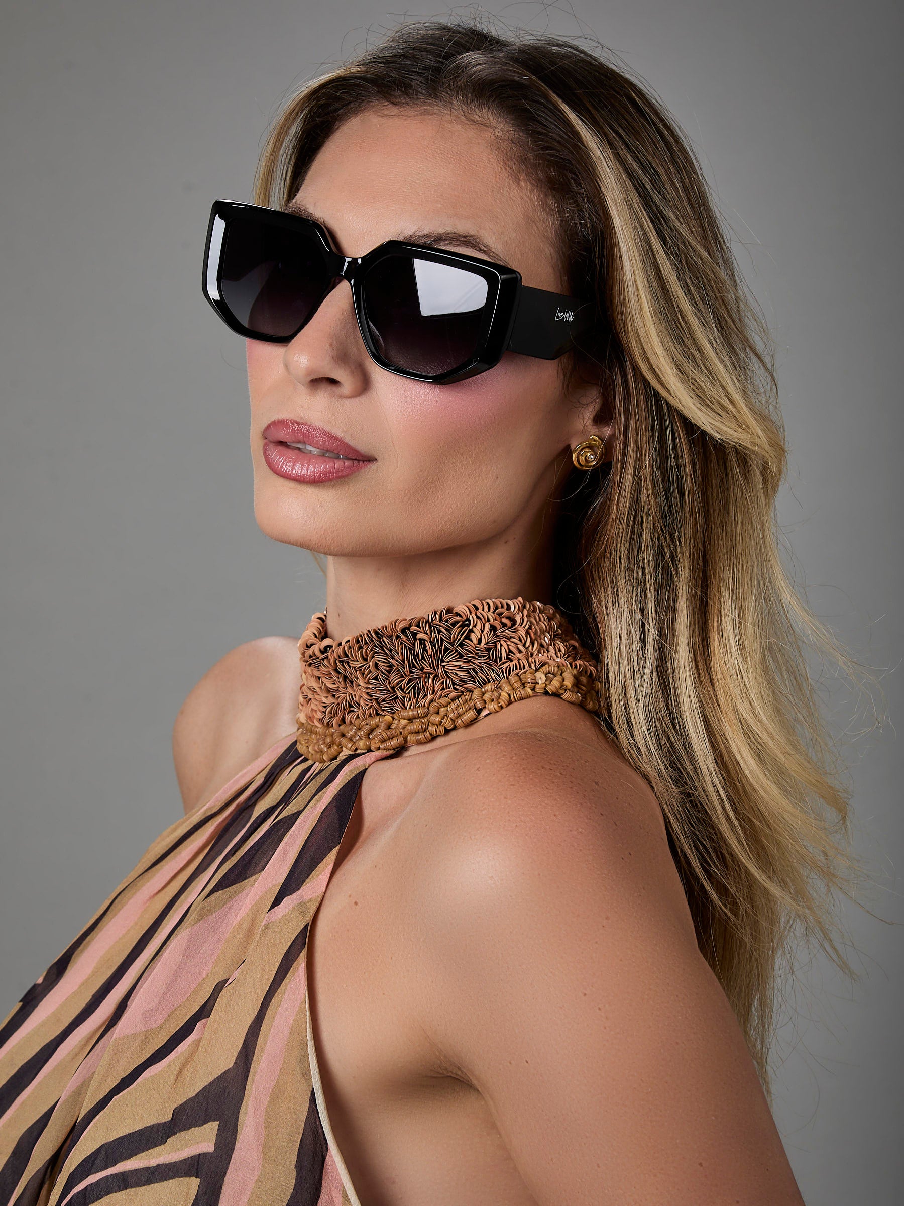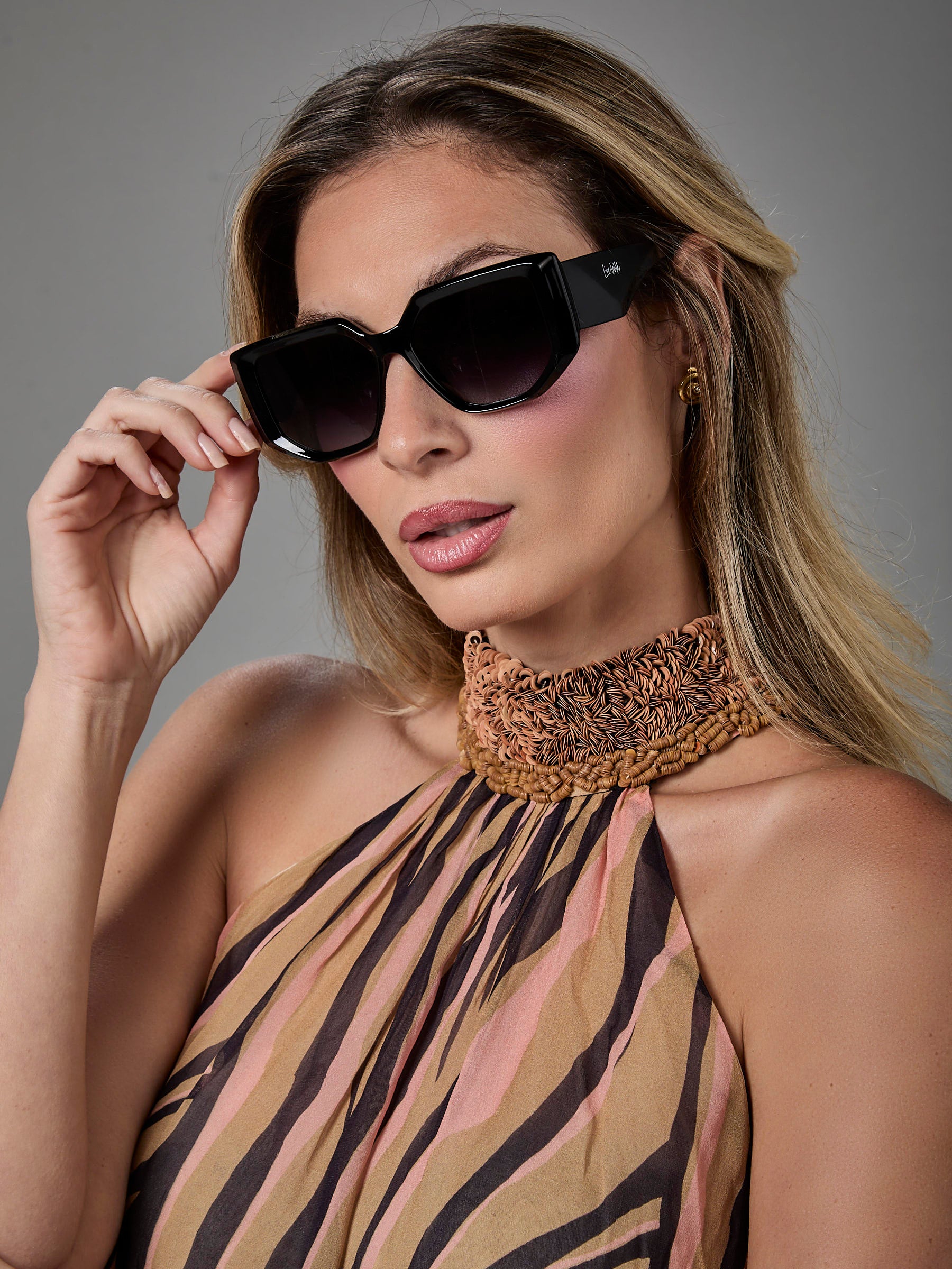 As hastes largas e angulares, com assinatura Live Wild gravada em prata discreta, reforçam o DNA da marca, ousado, contemporâneo e premium. O design geométrico das lentes, aliado à profundidade do preto, cria uma aura de luxo atemporal.