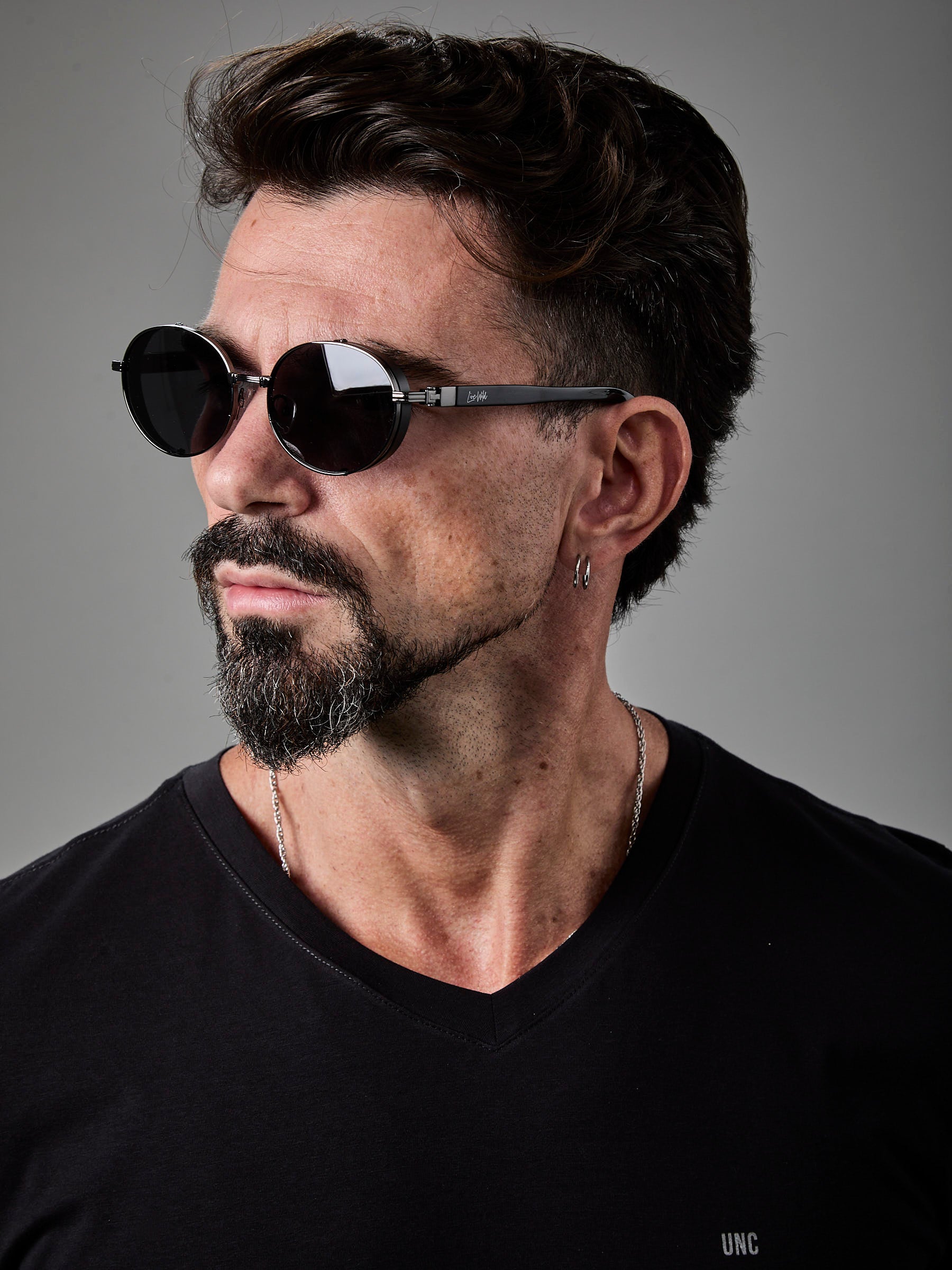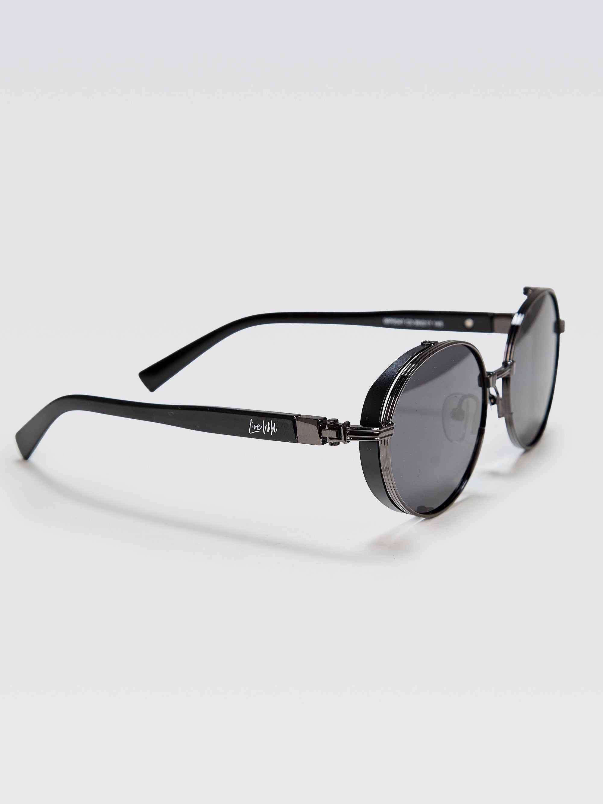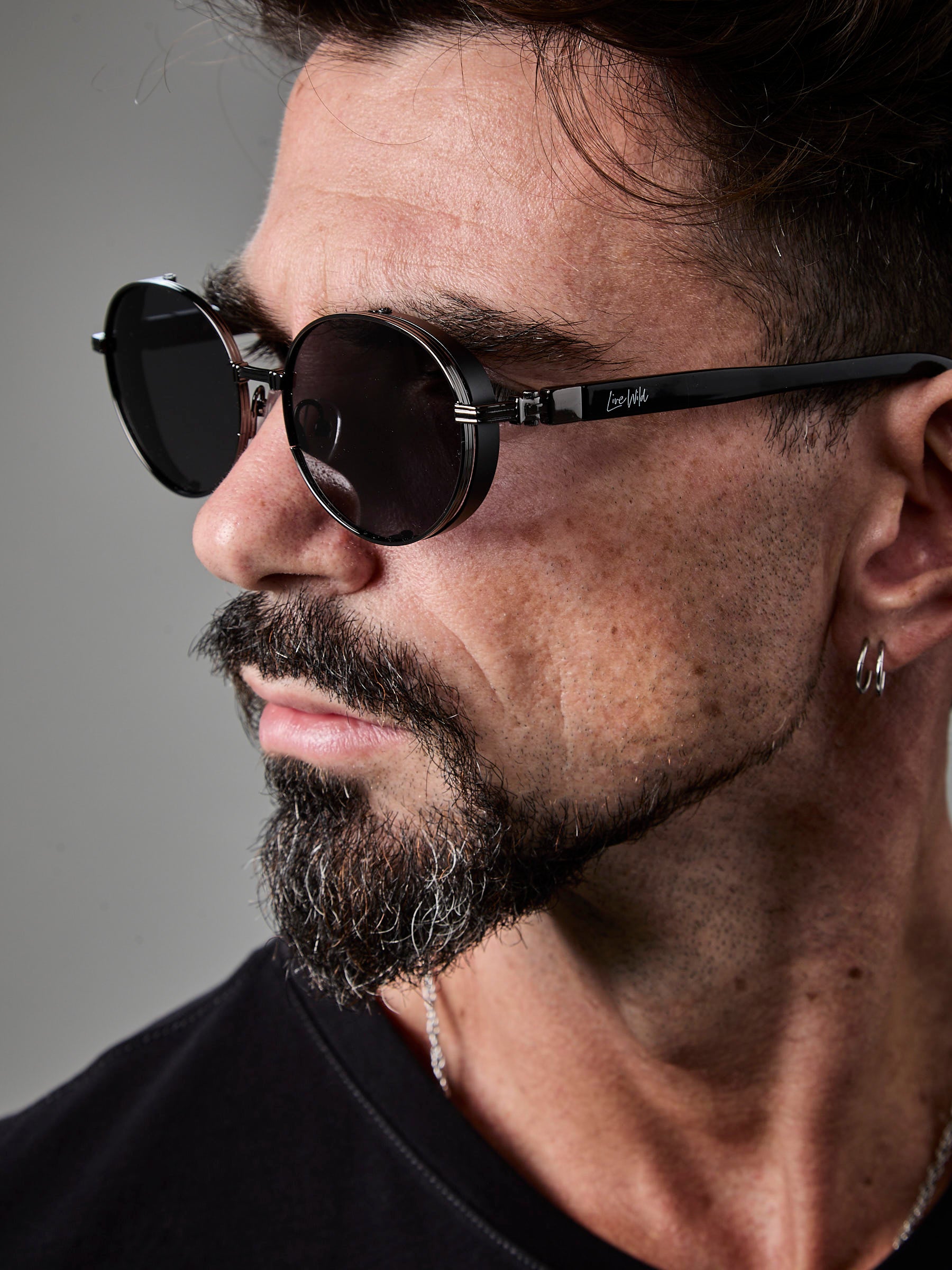 Sua armação em metal preto fosco traz um toque de poder e minimalismo, enquanto o interior das lentes apresenta um detalhe técnico com aros sobrepostos, adicionando profundidade e um visual futurista. As hastes em acetato preto polido, com o logo Live Wild gravado em prata, garantem conforto ergonômico e um acabamento impecável.