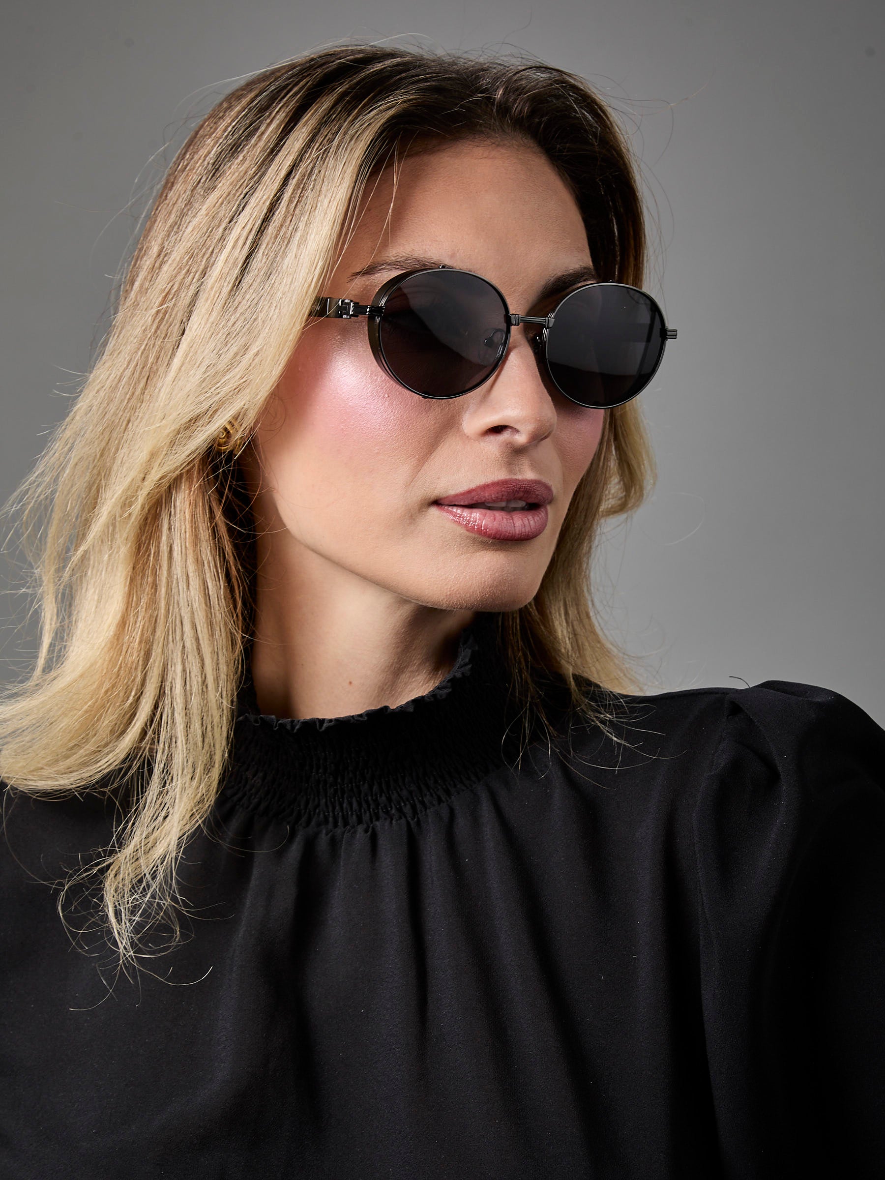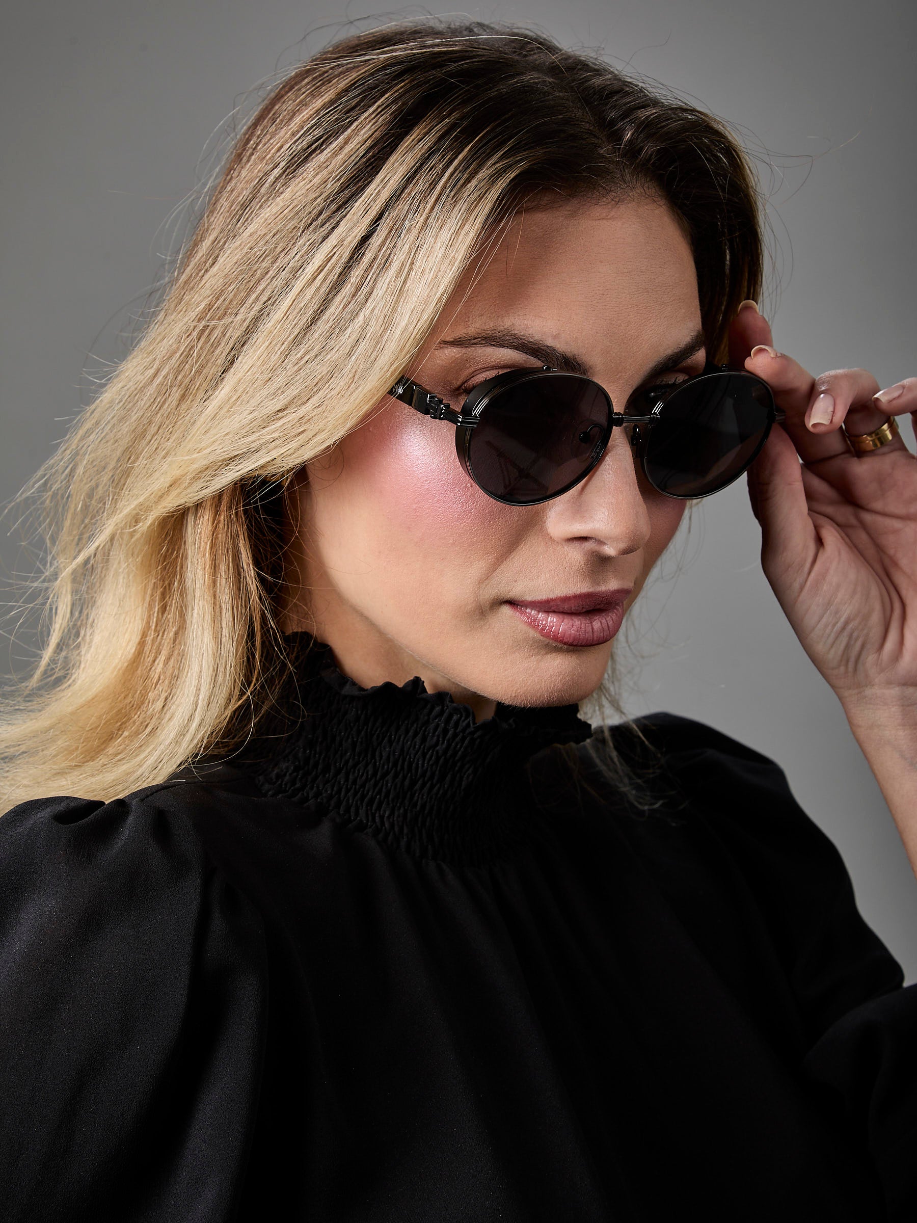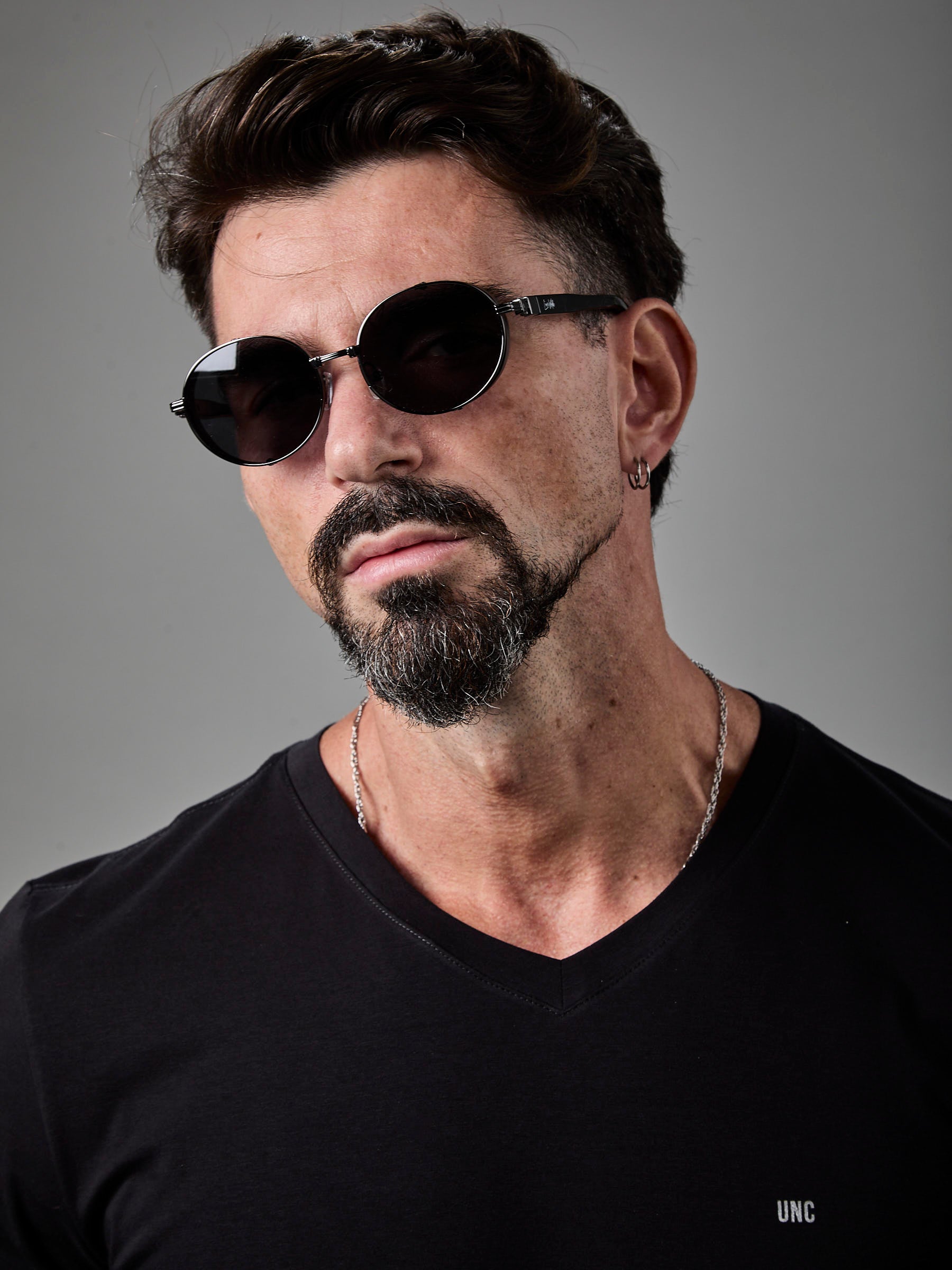 Sua armação em metal preto fosco traz um toque de poder e minimalismo, enquanto o interior das lentes apresenta um detalhe técnico com aros sobrepostos, adicionando profundidade e um visual futurista. As hastes em acetato preto polido, com o logo Live Wild gravado em prata, garantem conforto ergonômico e um acabamento impecável.