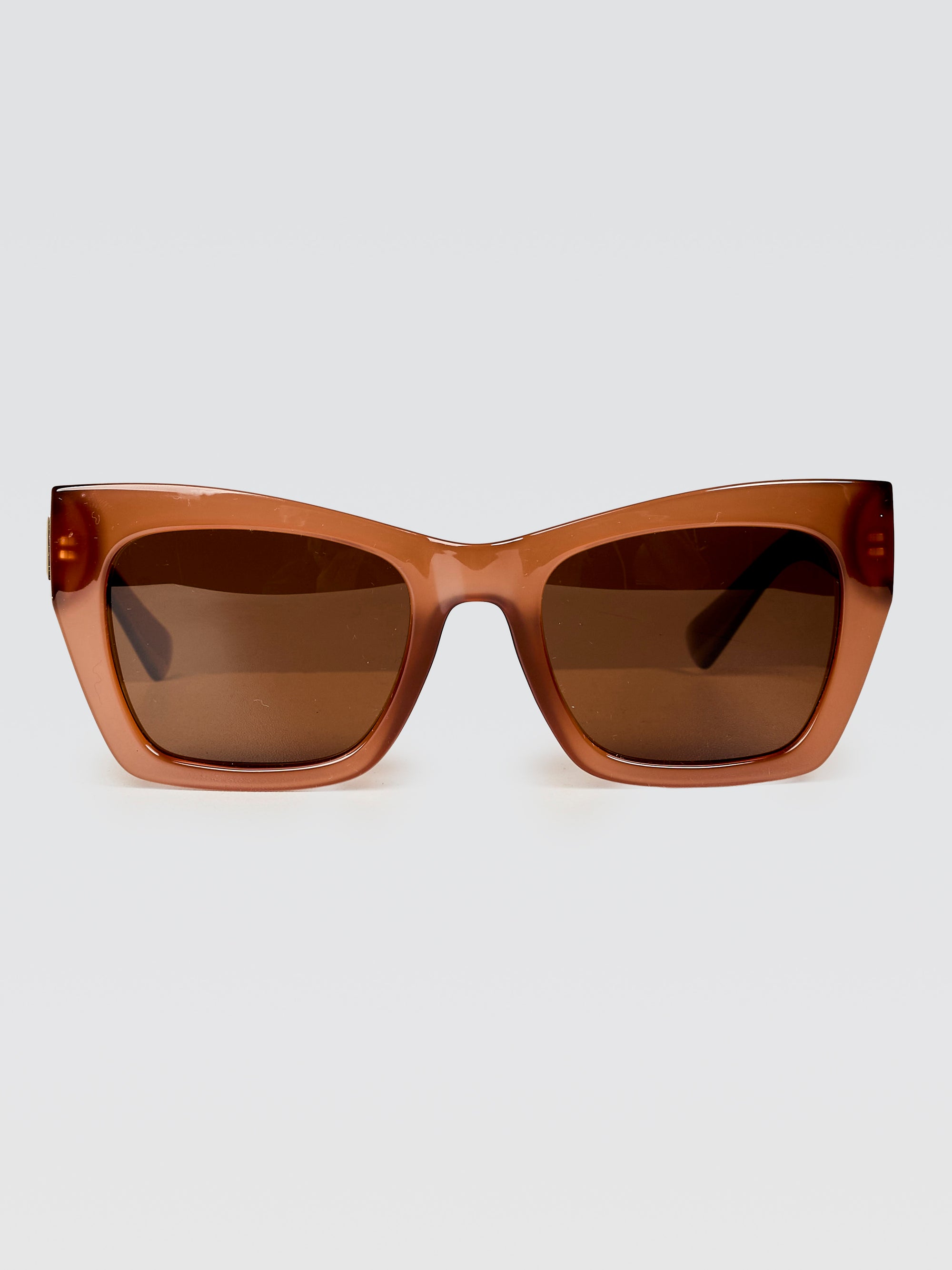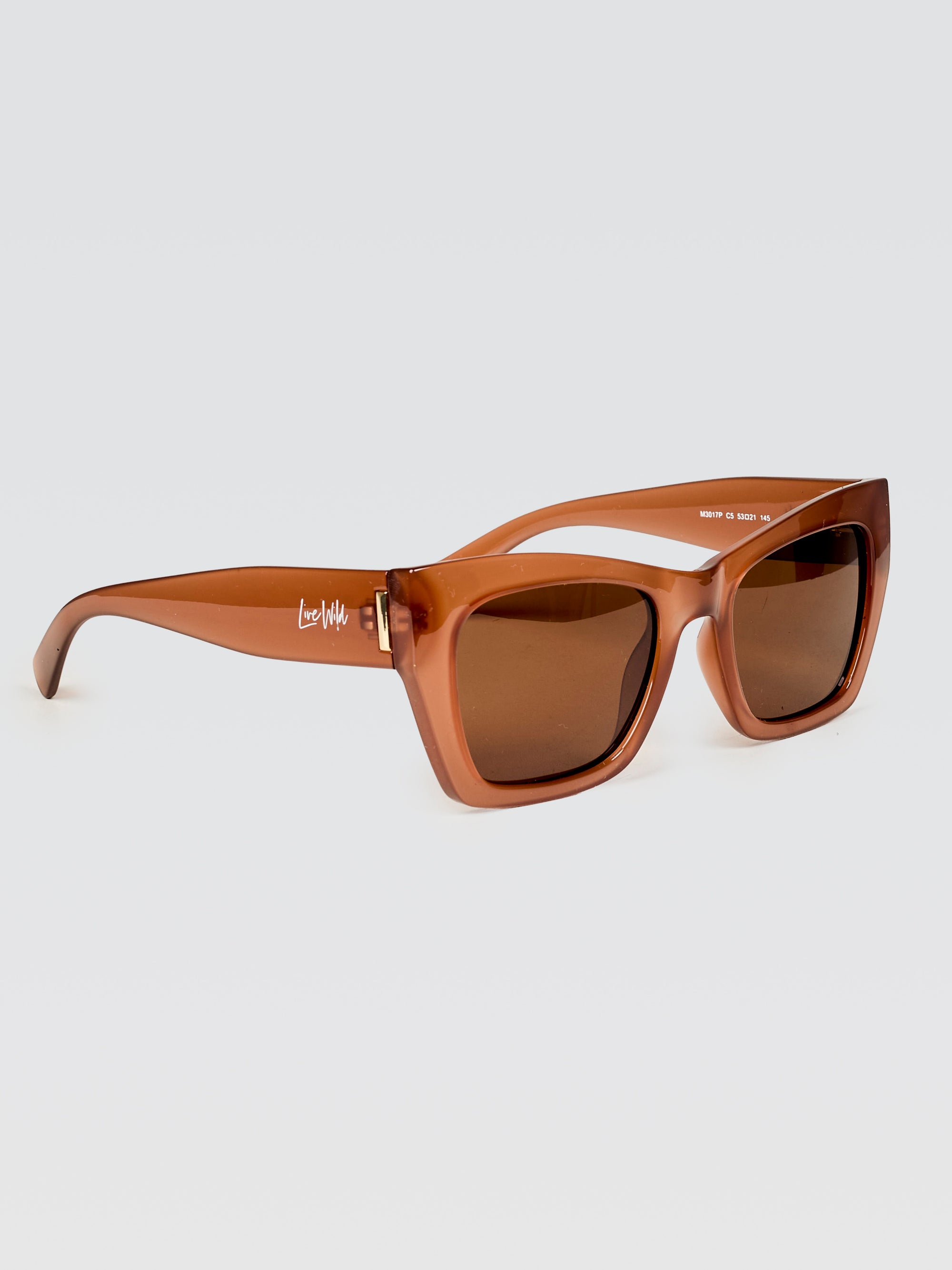O Sienna apresenta uma armação robusta em tom caramelo quente, com acabamento polido e linhas retas que transmitem presença e sofisticação imediata. As hastes largas, com assinatura Live Wild aplicada de forma discreta, reforçam o design premium e garantem conforto absoluto no uso diário.