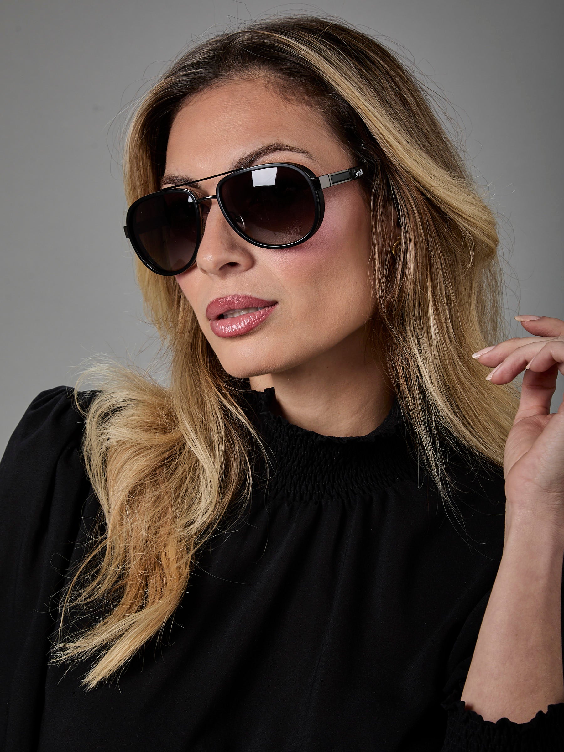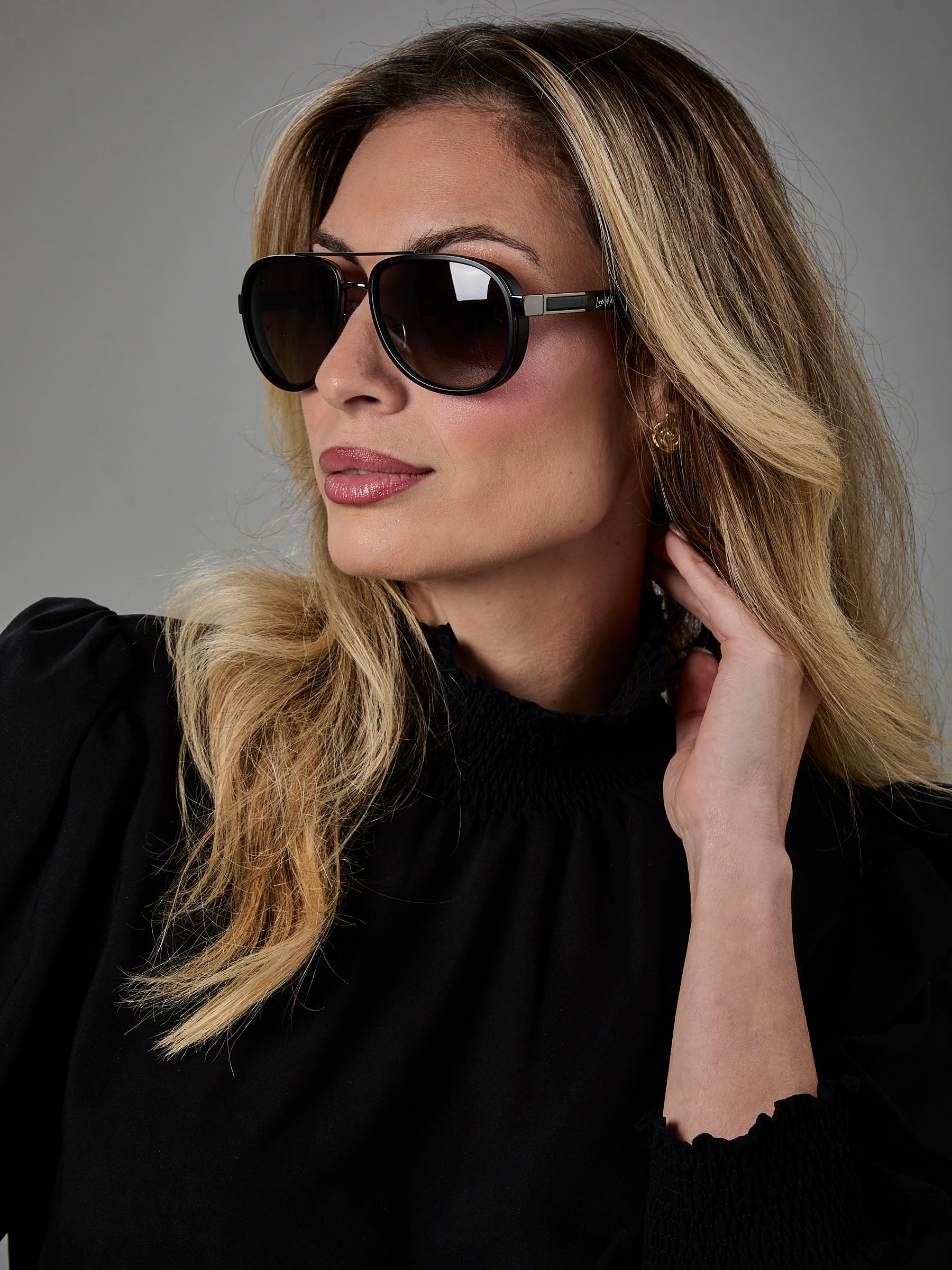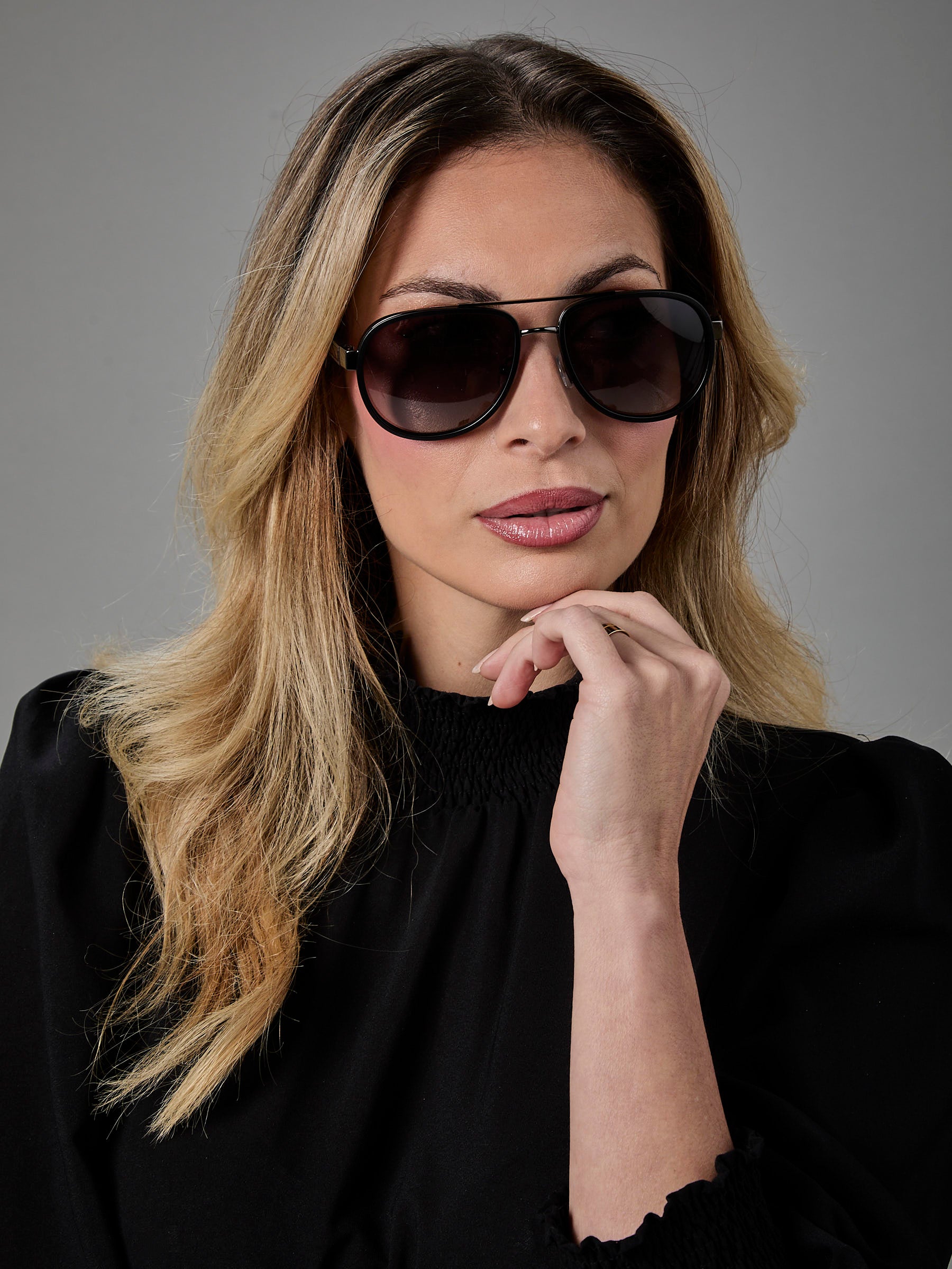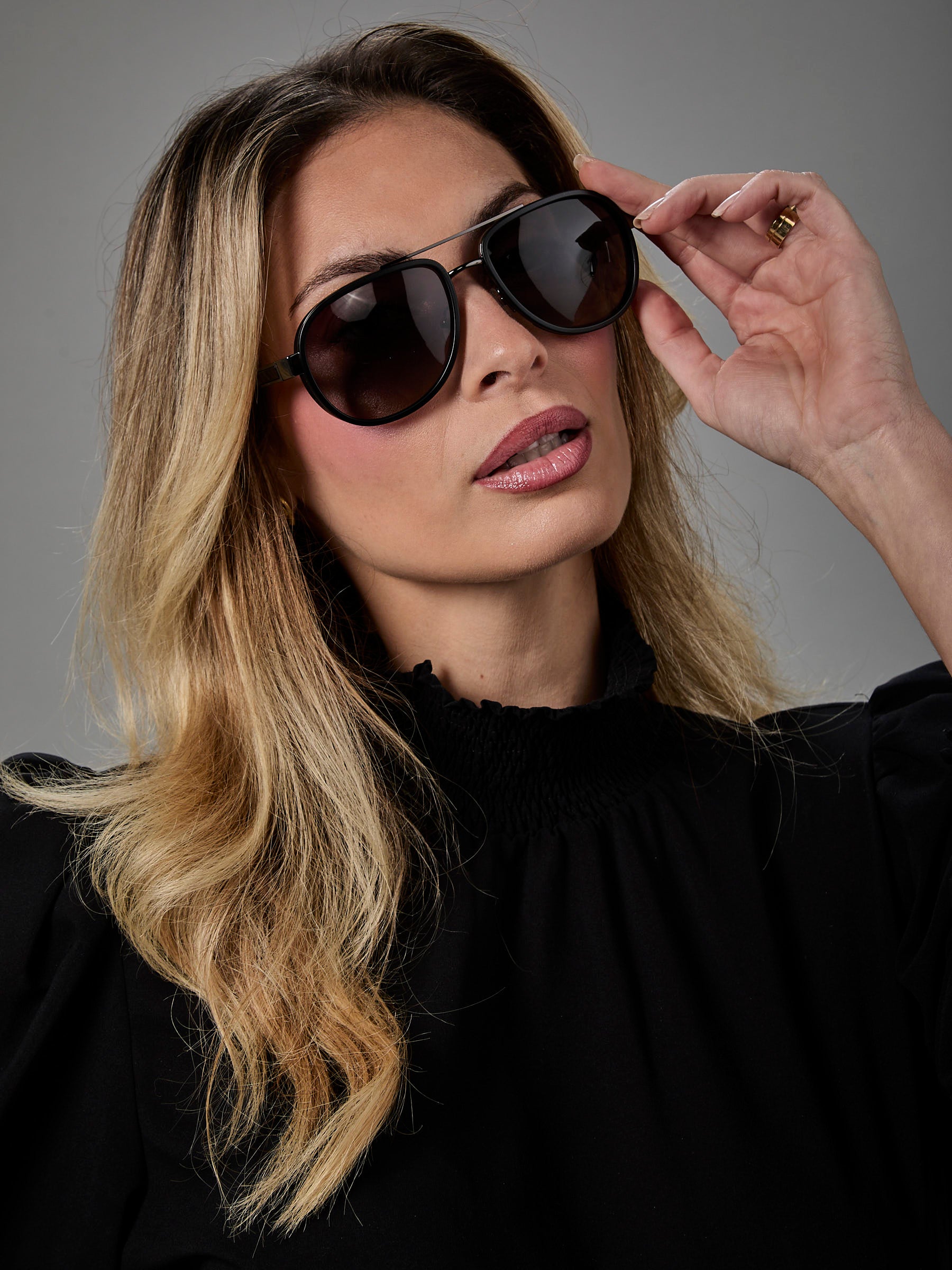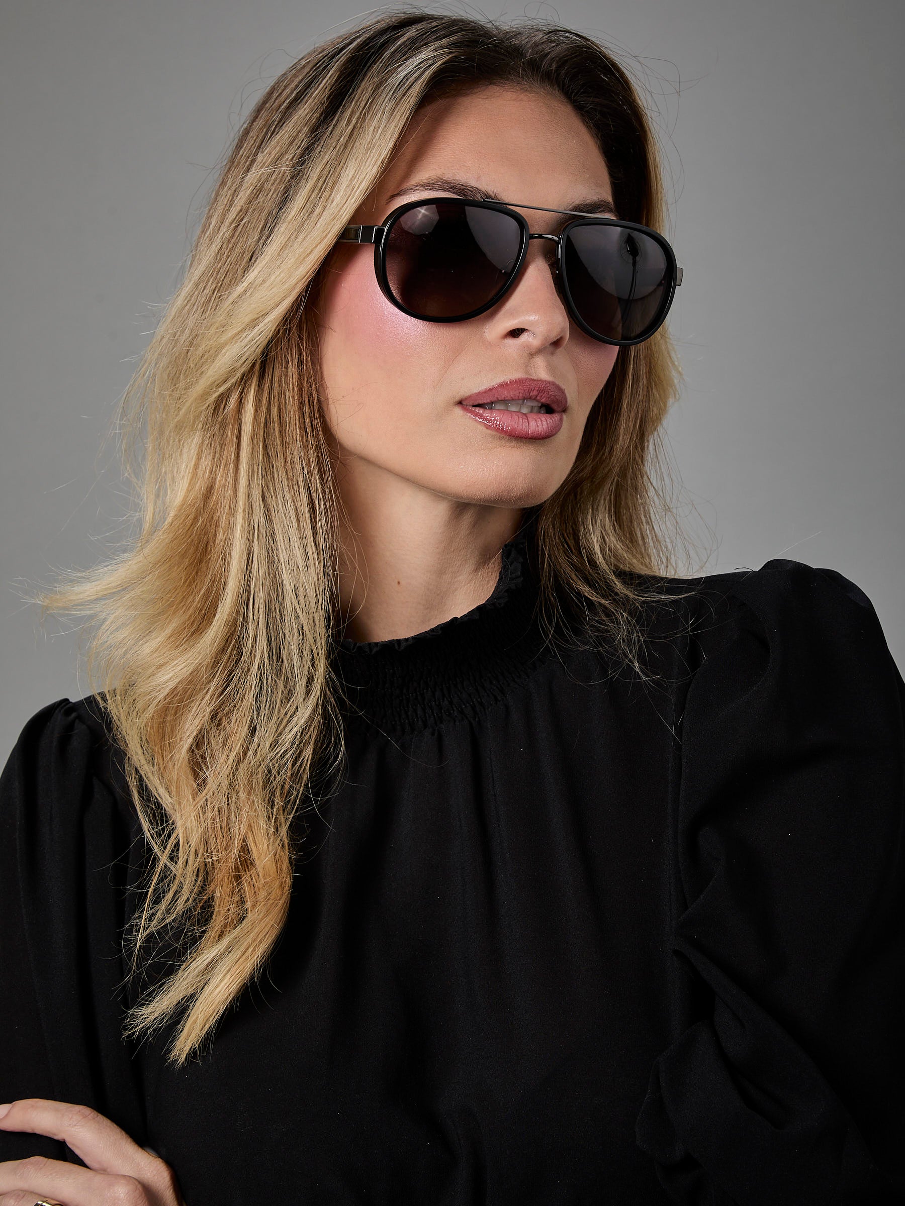 Com armação metálica em preto profundo e curvas arredondadas de inspiração aviator moderna, ele traduz confiança e domínio em cada detalhe. As hastes minimalistas com acabamento fosco reforçam sua estrutura leve, precisa e absolutamente refinada.