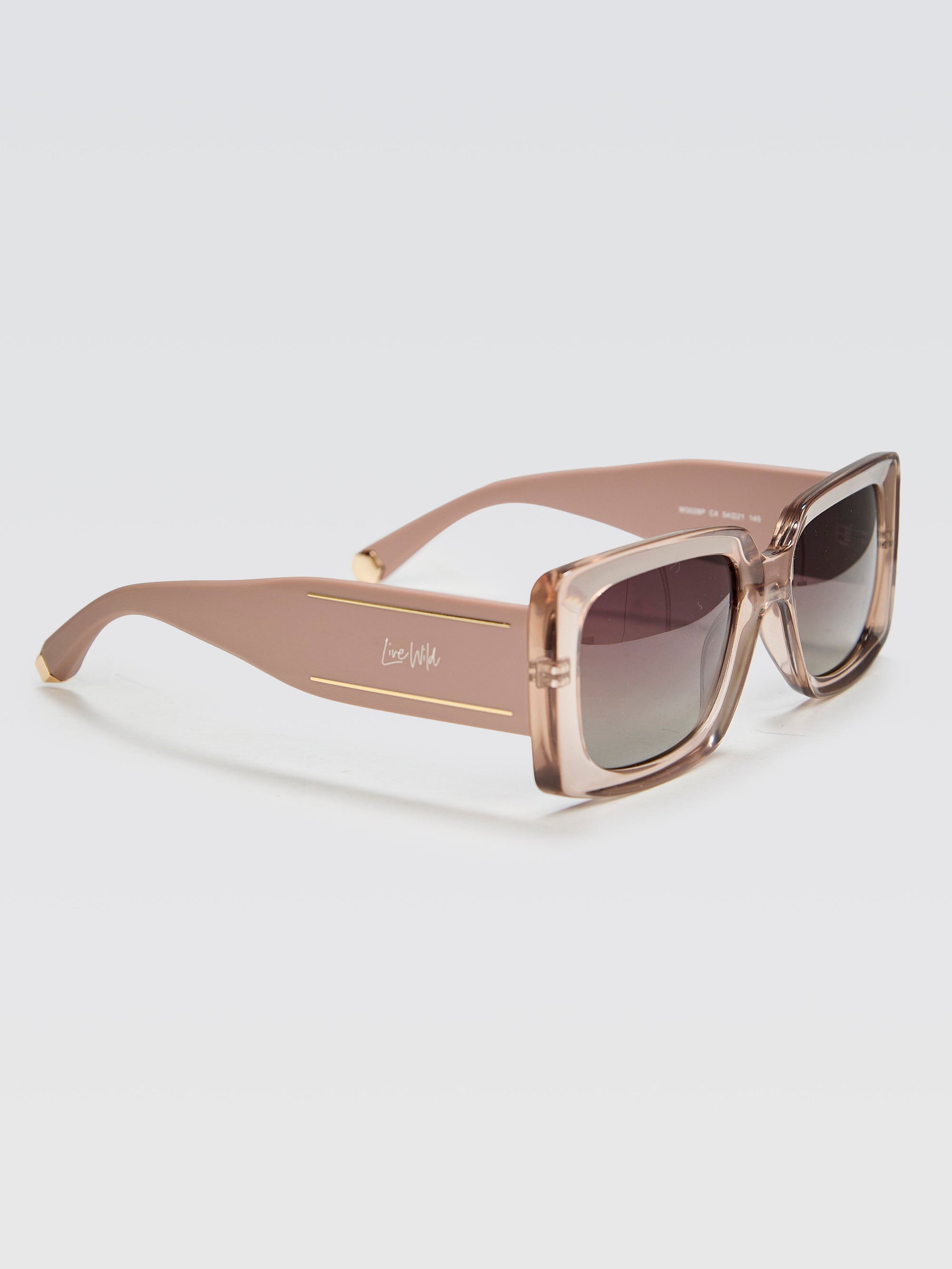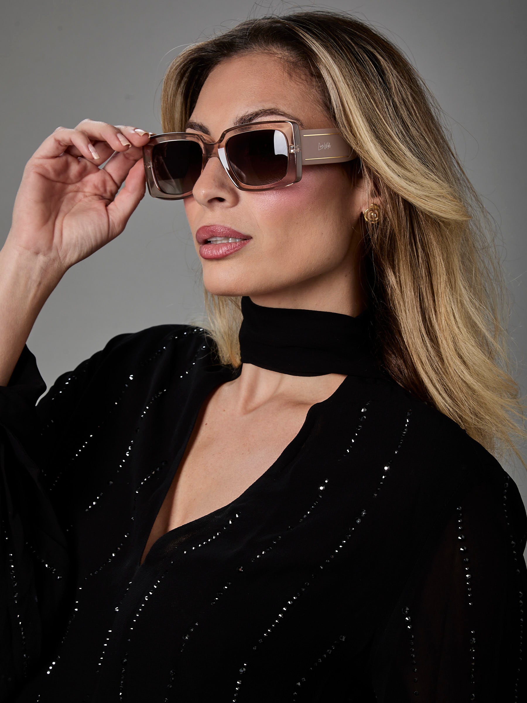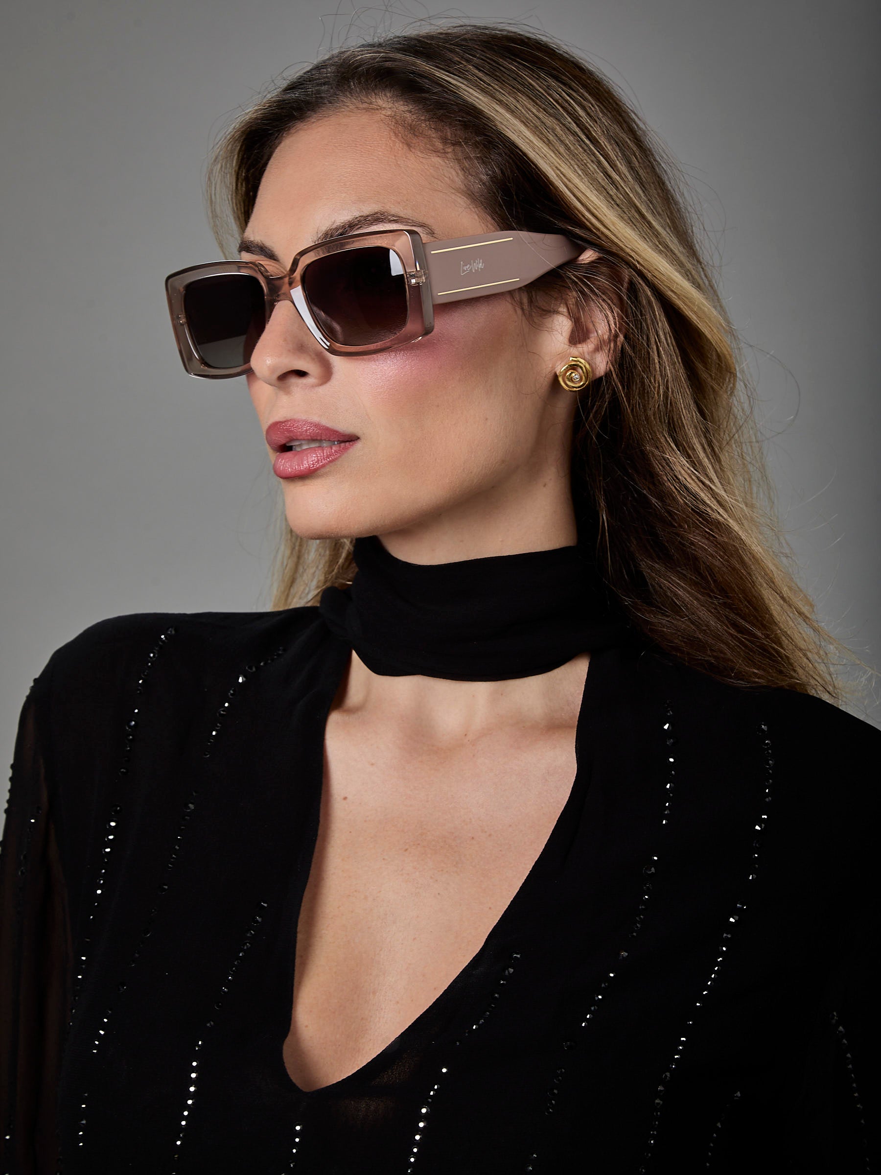 As hastes largas em acetato premium trazem acabamento fosco e detalhe dourado metálico com linhas finas horizontais, conferindo um toque de luxo sutil. As ponteiras em metal dourado geométrico reforçam o design exclusivo e moderno da peça.
